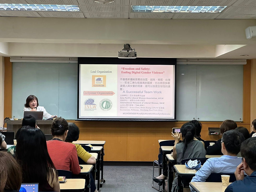來自各國的專業人士與青年代表分享其國家中 #性別暴力的多元樣態,包括LGBT+族群處境惡化、保守勢力再度抬頭,以及政治環境對女性公共參與的限制等議題。透過國際會議的交流,我們不僅深化對全球趨勢的理解,也拓展跨國民間合作網絡,在突破外交限制的同時,強化民主盟友之間的連結,共同防制跨境的數位性別暴力與人權侵害。